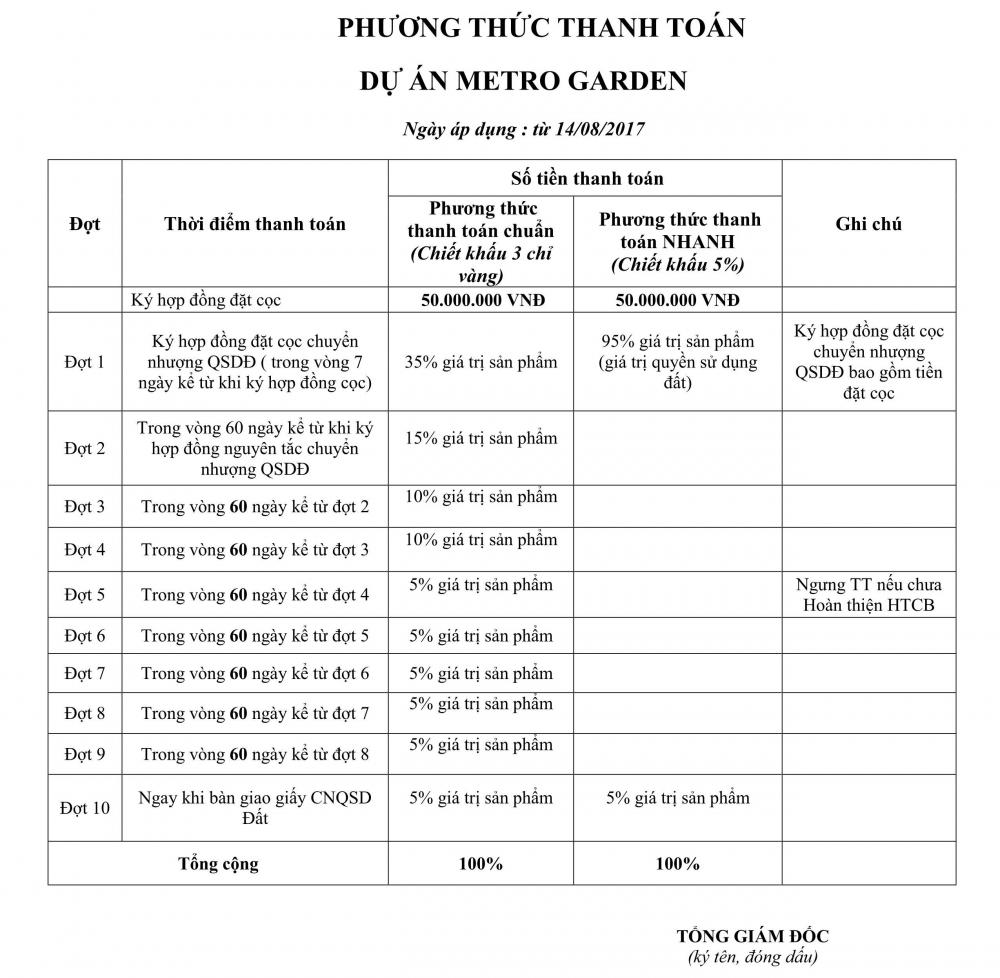 Lộ trình thanh toán Metro Garden