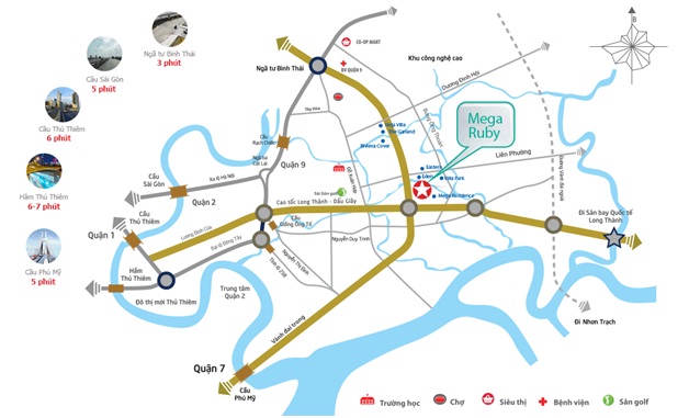 Mega Ruby nơi được tập trung đầu tư về cơ sở hạ tầng với hàng loạt các tuyến đường trọng điểm đã được hoàn thiện và đưa vào sử dụng: Cầu Thủ Thiêm, Cầu Phú Mỹ, Hầm Thủ Thiêm, Cầu Sài Gòn 2, Đường vành đai trong và mới đây nhất là tuyến đường cao tốc Tp.HCM – Long Thành – Dầu Giây vừa thông xe đoạn từ Tp.HCM về Long Thành vào 01/2014.