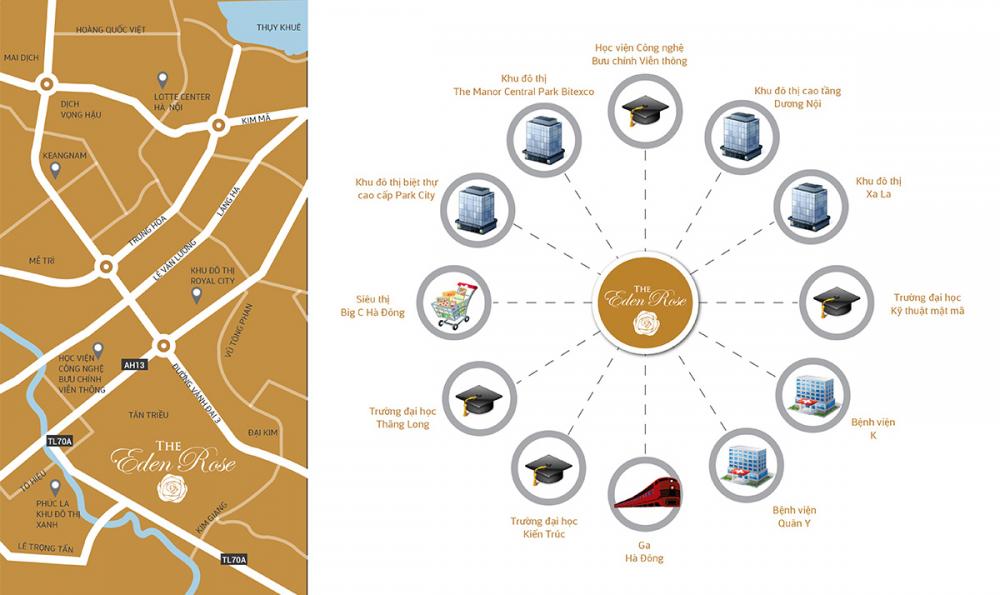 The Eden Rose nằm trong chuỗi đô thị hiện đại khu phía Tây và Đông Nam Hà Nội: KĐT Dương Nội, KĐT Biệt thự cao cấp Park City, khu đô thị Văn Phú,… với nhiều dịch vụ tiện ích có sẵn như: Bệnh viện K, Bệnh viện Quân Y, ga Hà Đông.