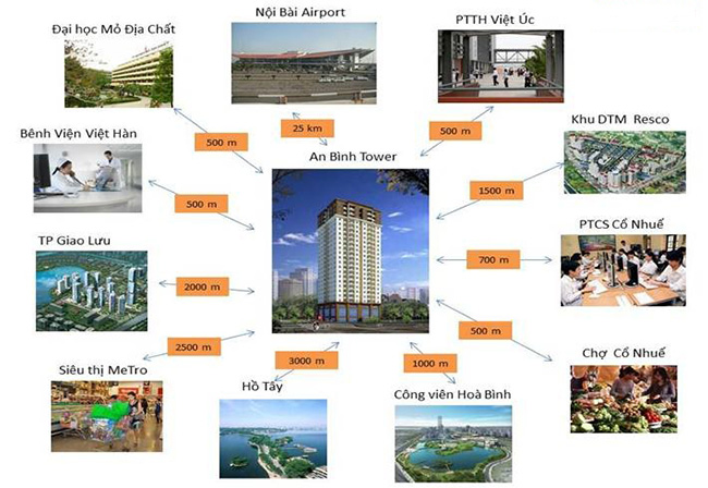 An Bình Tower tọa lạc tại mặt đường 69, cách ngã tư Phạm Văn Đồng - Cổ Nhuế 1.5km, nằm trong quần thể Khu đô thị Resco, Khu nhà Liền kề xóm 19 Cổ Nhuế, gần đường 40m trong tương lai sẽ kết nối hạ tầng với Khu đô thị Bắc Cổ Nhuế - Chèm do Geleximco và Udic xây dựng với đầy đủ các tiện ích công cộng, dịch vụ mang lại một môi trường sống lý tưởng cho cư dân tại đây.