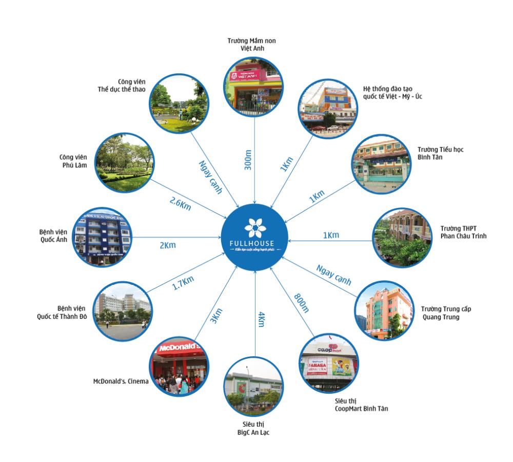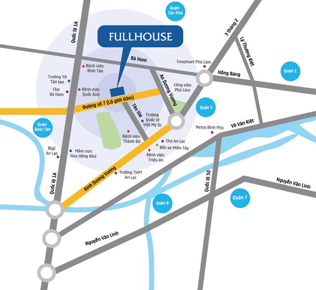 Căn hộ Full House sở hữu vị trí hết sức thuận lợi khi có tới 4 mặt tiền đường 60m với 6 góc nhìn khác nhau, nằm giữa các giao lộ đường số 7, đường số 34, đường số 43 và hẻm 444, Khu Tên Lửa, thuận lợi trong việc kết nối giao thông với các tuyến đường huyết mạch ra trung tâm Sài Gòn.