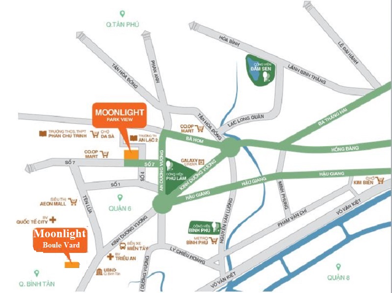 Moonlight Boulevard tọa lạc tại số 510 Kinh Dương Vương, phường An Lạc A, quận Bình Tân, Tp.HCM. Dự án nằm trong khu dân cư hiện hữu, có vị trí tiếp giáp với Khu dân cư An Lạc, Bình Trị Đông. Chung cư có phía Bắc giáp với khu dân cư của Công ty Sunimex, tiếp giáp với đường Vành đai, Tên Lửa, vòng xoay Phú Lâm.