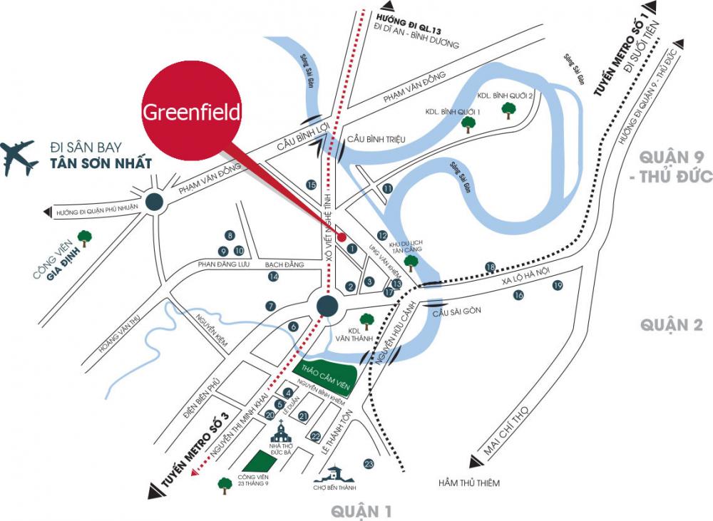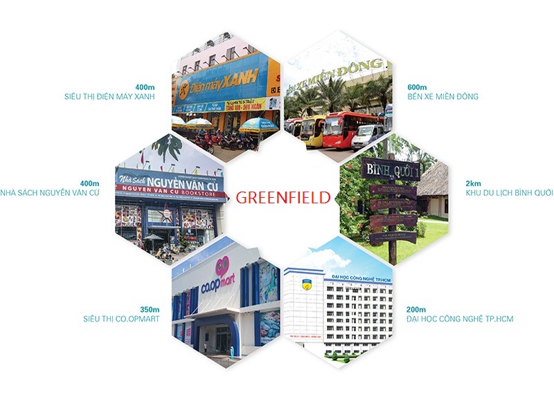 Nằm ở khu vực sầm uất nhất nhìn quậnBình Thạnh, căn hộ Green Fieldliền kề với hàng loạttiện ích về y tế, giáo dục, trung tâm thương mại, chợ,mua sắm giải trí... phục vụcuộc sống của cư dân. Dự án còn sở hữu công viên bờ sông, hứa hẹn sẽ đem đếnmôi trường vui chơi, rèn luyện sức khỏe và cuộc sống an sinhtốt nhấtchoquý khách hàng.