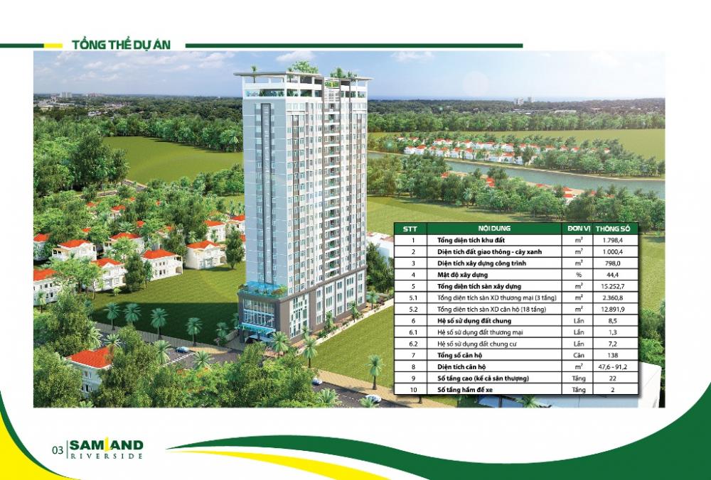 Căn hộSamland Riverside được xây dựng trên khu đất diện tích 1.798,4m2. Trong đó, diện tích đất giao thông - cây xanh là 1.000,4m2, diện tích xây dựng công trình là 798,0m2, mật độ xây dựng là 44,4m2, tổng diện tích sàn 15.252,7m2. Chung cư cao 22 tầng, 2 tầng gửi xe với tổng cộng 138 căn hộ, các căn hộ có diện tích đa dạng từ 47,6-91,2m2, diện tích sàn xây dựng thương mại 2.360,8m2 (3 tầng), diện tích sàn xây dựng căn hộ 12.891,9m2 (18 tầng).