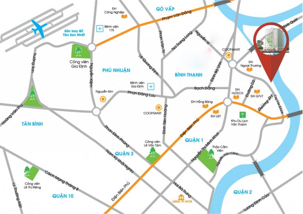 Từ dự án đến trung tâm quận 1 chỉ từ 5-10 phút, qua tuyến đường Nguyễn Thị Minh Khai, Nguyễn Hữu Cảnh tới sân bay Tân Sơn Nhất qua đường Phạm Văn Đồng. Đây cũng là khu trường quốc tế, làng đại học cũng như phố ngân hàng nằm ngay trên đường D1 chỉ với bán kính 1,5km.