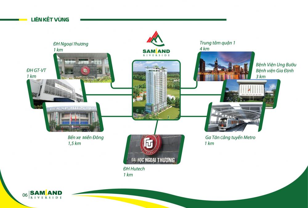 Chung cư Samland Riverside tọa lạc ngay trung tâm quận Bình Thạnh, đây là vị trí đắc địa với ưu thế vượt trội, thuận lợi cho việc đi lại và kết nối với những trung tâm hiện hữu và trung tâm mới của Tp.HCM - Khu đô thị Thủ Thiêm.