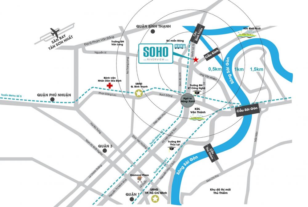 Dự án Soho Riverview tọa lạc tại 533 đường Xô Viết Nghệ Tĩnh, phường 26, quận Bình Thạnh, Tp.HCM. Từ Soho Riverview, bạnchỉ mất 10 phút vào quận 1 và 15 phút đến các quận lân cận vàdể dàng lưu thông trên đường mà không bị ùn tắt giao thông vào giờ cao điểm.