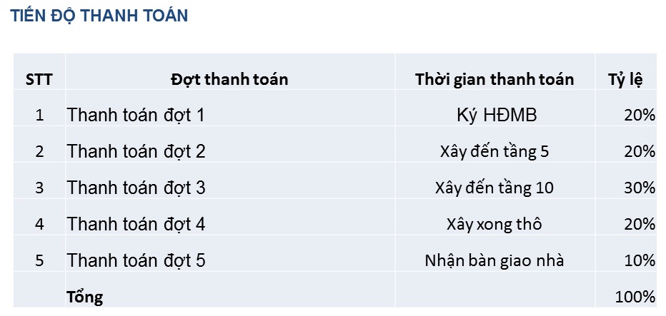 Giá bán 20.500.000 đồng/m2 thông thuỷ (bao gồm giá trị quyền sử dụng đất, Thuế GTGT và nội thất cơ bản). Đặc biệt, sau 50 ngày bàn giao nhà nhận ngay sổ đỏ.