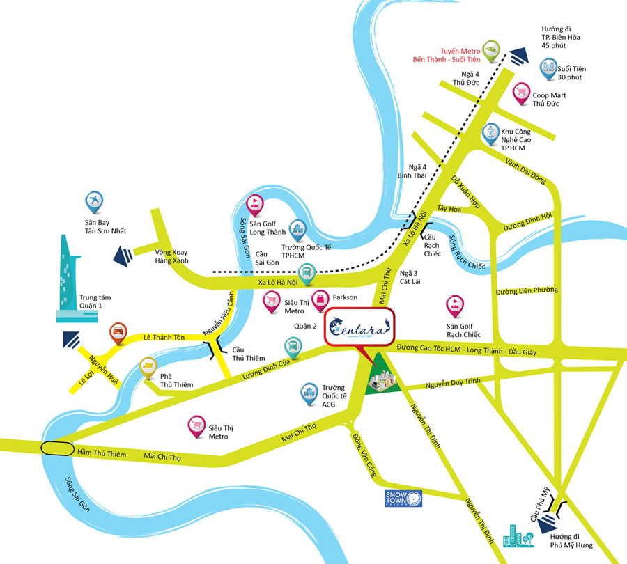 - Hệ thống vui chơi giải trí phong phú: Khu vui chơi tuyết trong nhà Snow Town đầu tiên ở Sài Gòn tọa lạc tại khu phức hợp căn hộ - TTTM CBD quận 2 cũng do công ty Phước Thành làm chủ đầu tư, hệ thống rạp chiếu phim CGV, Lotte,... Khu du lịch Suối Tiên.