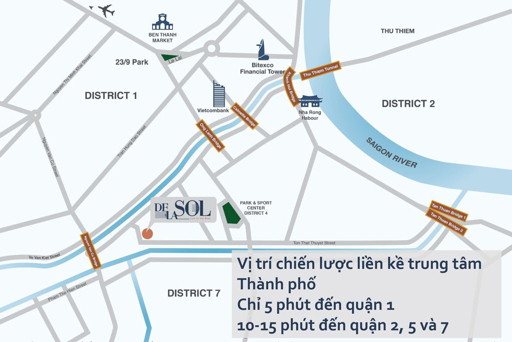 De La Sol là căn hộ siêu sang tọa lạc ngay trung tâm thương mại quận 4, Tp.HCM. Dự án sở hữu vị trí đắc địa, nhìn bao quát toàn cảnh sông Kênh Tẻ - sông Sài Gòn. Hai dòng chảy giao thoa mang tới những mạch sống xanh tươi và những làn gió mát lành.