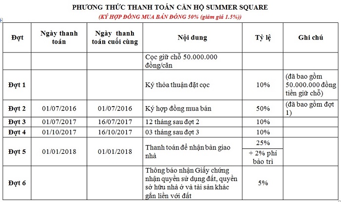 Phương thức thanh toán tại dự án Summer Square: