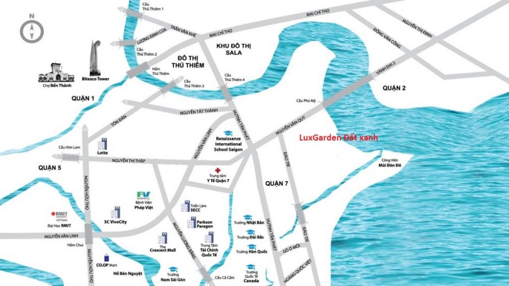 Chung cư LuxGarden toạ lạc tại số 370 đường Nguyễn Văn Quỳ, thuộc phường Tân Thuận, quận 7, Tp.HCM. Từ dự án, cư dân có thể di chuyển dễ dàng về các quận của thành phố như quận 1 và quận 4 bằng cầu Tân Thuận, quận 2 qua cầu Phú Mỹ, quận 8, huyện Nhà Bè...