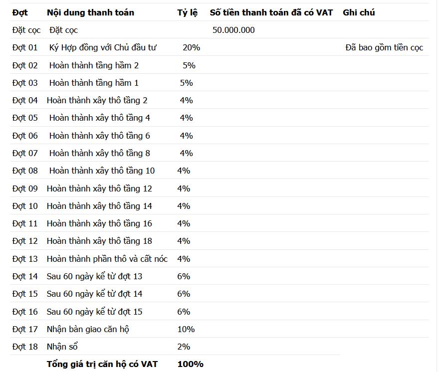 - Thanh toán theo tiến độ dự án 2 tháng trả 4% - giao nhà block đầu tiên vào quý I/2020