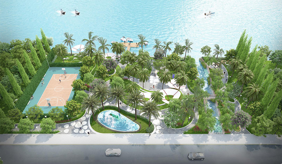 Công viên, sân cầu lông và bóng rổ ven sông