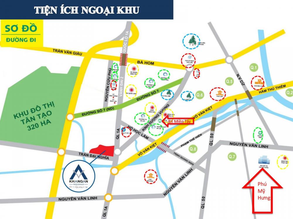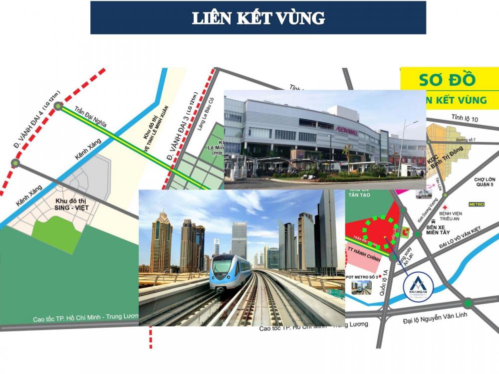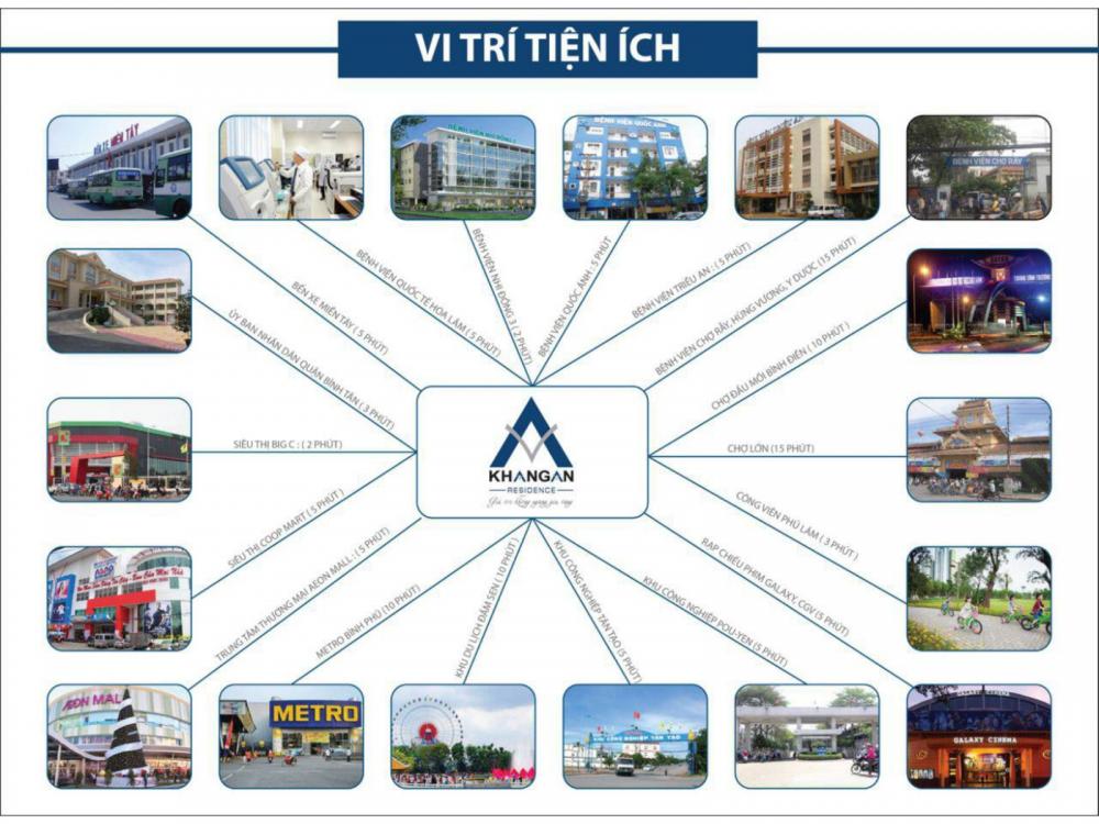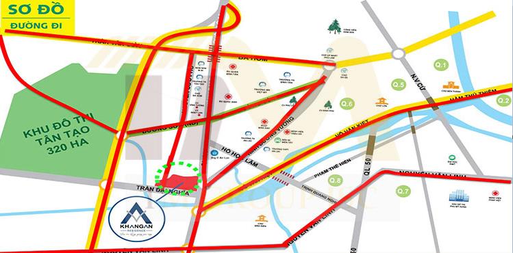 Dự án Khang An Residence tọa lạc ngay nút giao thông quan trọng Quốc lộ 1A - Võ Văn Kiệt - Kinh Dương Vương, cách nhà ga Tân Kiên nơi tuyến Metro số 3 chạy qua. Từ dự án, cư dân chỉ mất 10 phút để tới những quận trung tâm như quận 1, 3, 5. Dự án cách đường cao tốc Trung Lương - HCM 1,5km, cách trung tâm mua sắm như Big C 1km, cách trung tâm mua sắm Aeon chỉ 2km, đây là một trung tâm mua sắm do Nhật Bản đầu tư có quy mô lớn nhất Việt Nam hiện tại.