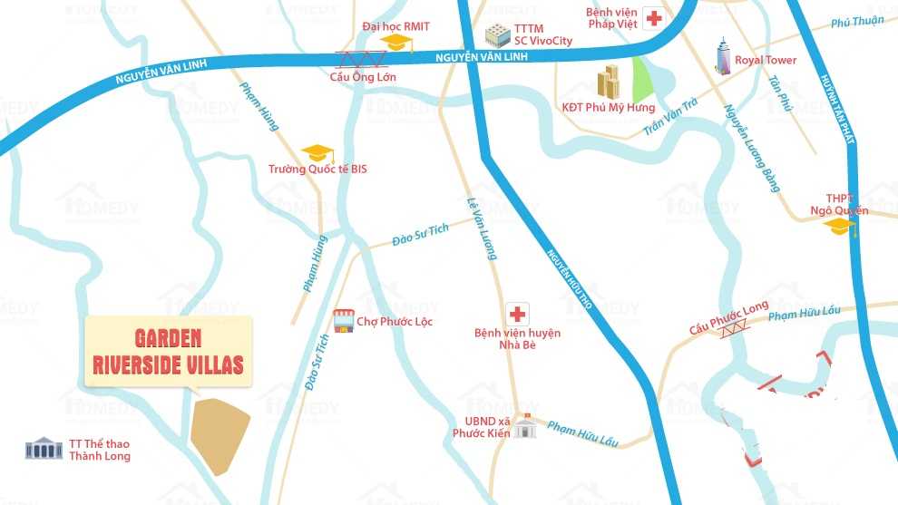 Garden Riverside Villas nằm mặt tiền đường Chánh Hưng -Nguyễn Tri Phương (nối dài), được baobọc bởi 3 mặt sông và liền kề các khu 6B, T30, Đại Phúc.
