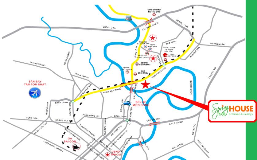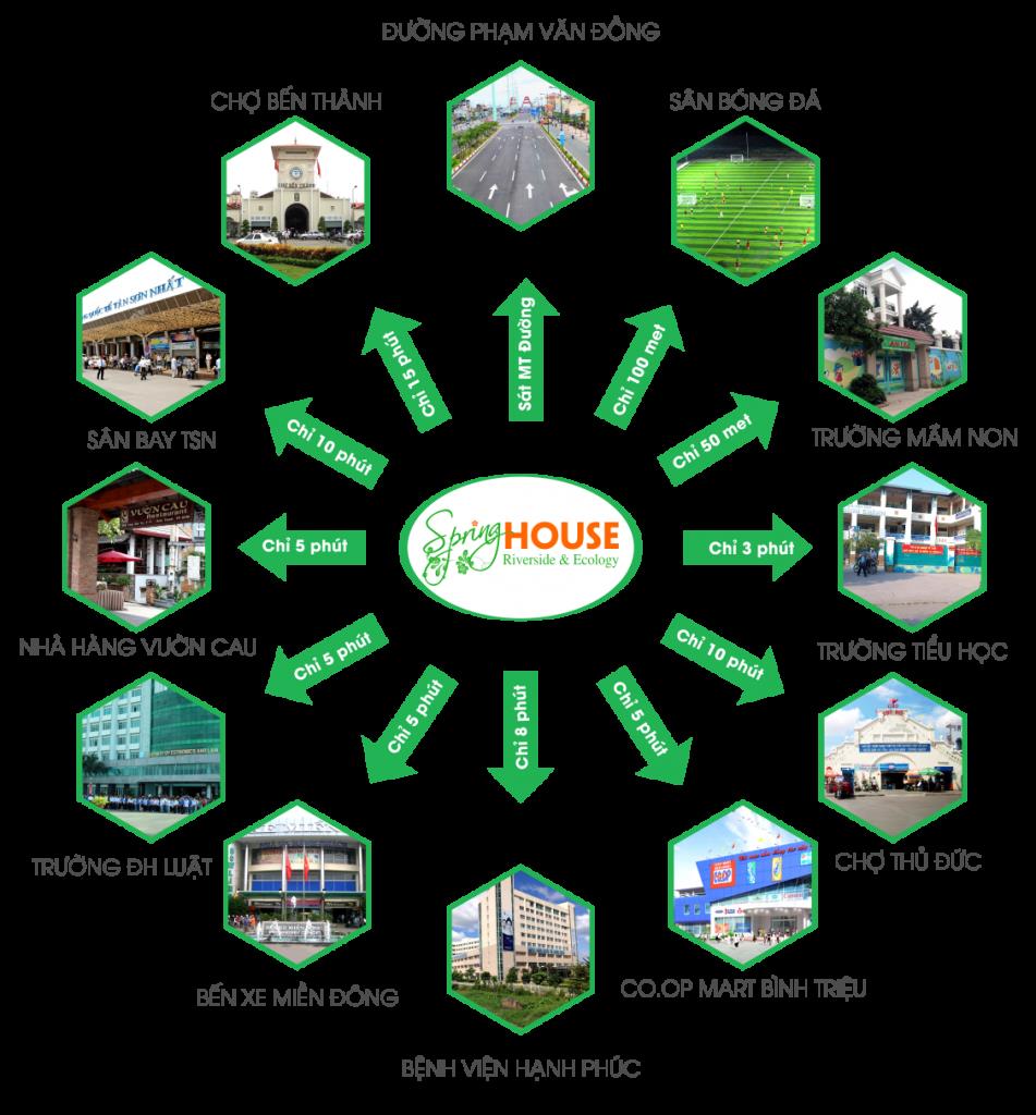 Spring House tọa lạc tại vị trí “Vàng” của phường Hiệp Bình Chánh, quận Thủ Đức, Tp.HCM, ngay vòng xoay giao lộ đầu tiên trên tuyến đường Phạm Văn Đồng hướng từ ngã tư Bình Triệu và cầu Bình Lợi, thuận tiện cho việc lưu thông trong khu vực.