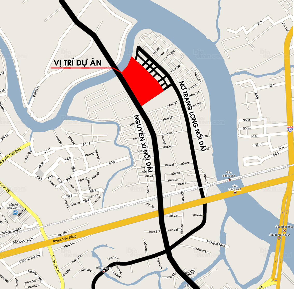 Khu dân cư Bình Hòa tọa lạc tại phường 13, Q. Bình Thạnh, TP HCM. Dự án được kết nối với hệ thống đường giao thông vô cùng thuận lợi, cạnh trục đường chính của khu dân cư – đường Nguyễn Xí nối dài (lộ giới 40m) nối trung tâm thành phố với Quận 12 và đường Xuyên Á, gần đường Vành đai trong Bình Lợi – Tân Sơn Nhất (lộ giới 60m).