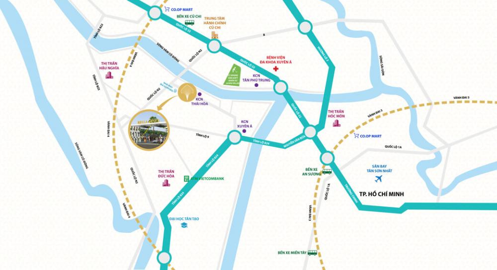 Dự án nằm ngay ranh giới giữa Tp.HCM (Thị trấn Củ Chi) và Long An (huyện Đức Hòa), trong khu dân cư hiện hữu, đối diện khu công nghiệp đang hoạt động với lượng công nhân lớn đi làm hàng ngày, cách trung tâm Củ Chi 4km hướng về Hồ Chí Minh.