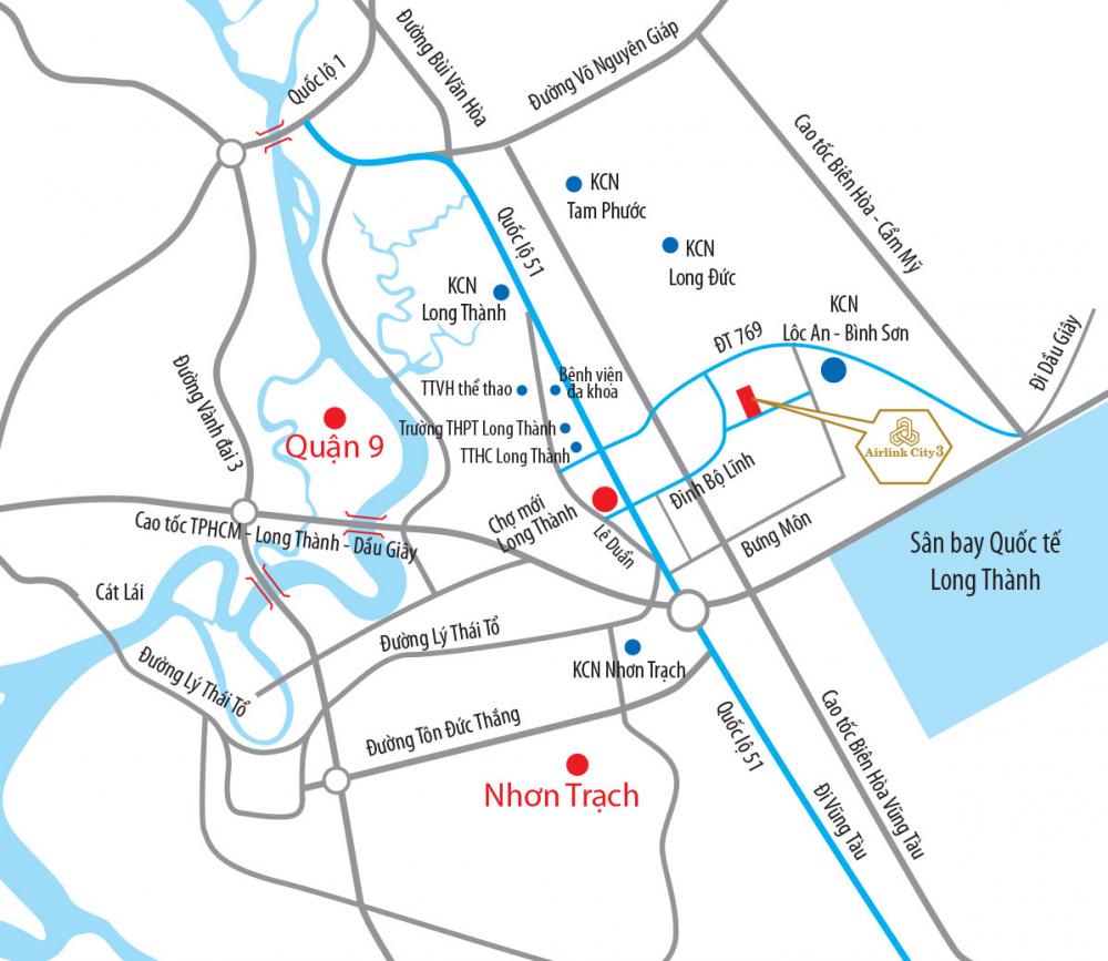 Airlink City 3nằm trên đường Bưng Cơ, xã Lộc An, Long Thành, Đồng Nai - tuyến đường liên kết trực tiếp với đường Đinh Bộ Lĩnh nối thẳng ra đườngĐT 769 và quốc lộ 51, cách trung tâm hành chính Long Thành chỉ khoảng 5 phút, sân bay quốc tế Long Thành chỉ 7 phút.