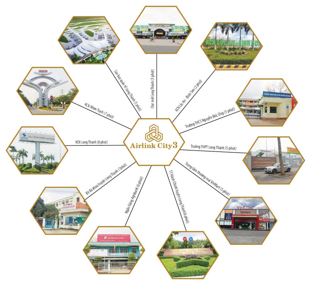 Chỉ trong vòng từ 5-7 phút di chuyển, cư dân Airlink City 3 đã có thể tiếp cận hàng loạt tiện ích có sẵn tạikhu vực như trung tâm y tế, trung tâm hành chính, trường mầm non, trường tiểu học Lộc An, chợ mới Long Thành, bệnh viện đa khoa, trung tâm thương mại Vincom,…