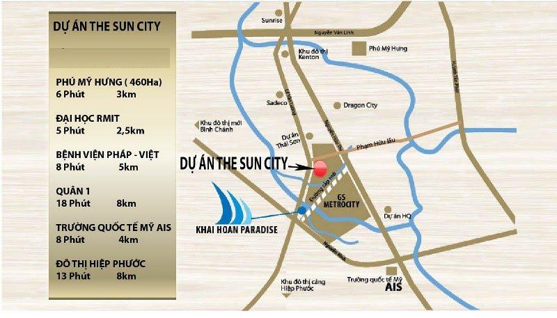 The Sun City Phước Kiểnnằm trên Đường Lê Văn Lương, Xã Phước Kiển, Nhà Bè, Tp.HCM. Dự án cách trung tâm quận 1 khoảng 8 km theo trục đường Bắc Nam theo hướng cầu Kênh Tẻ và cầu Ông Lãnh.