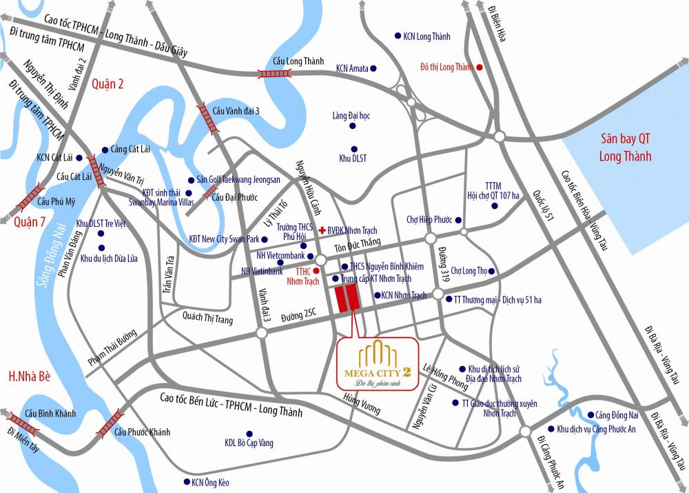 Nằm ngay trung tâm hành chính huyện Nhơn Trạch, một trong những đô thị công nghiệp dịch vụ lớn nhất của tỉnh Đồng Nai và là tâm điểm kết nối giữa Tp.HCM với sân bay quốc tế Long Thành, Khu đô thị thương mại Mega City 2 được phát triển với mục tiêu trở thành đô thị vệ tinh phục vụ chiến lược giãndân cho Tp.HCM. Tại đây, các chủ nhân không chỉ được tận hưởng một cuộc sống hiện đại, tiện nghi mà còn được sở hữu một bất động sản rất giàu tiềm năng gia tăng giá trị, nhờ hạ tầng đang phát triển nhanh chóng, tốc độ đô thị hóa và phát triển kinh tế rất cao.