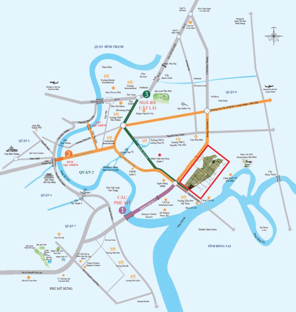 - Cung 2: Cầu Thủ Thiêm hoặc Hầm Thủ Thiêm - >> đại lộ Mai Chí Thọ - >> Đường Đồng Văn Cống ->> KDC Ninh Giang