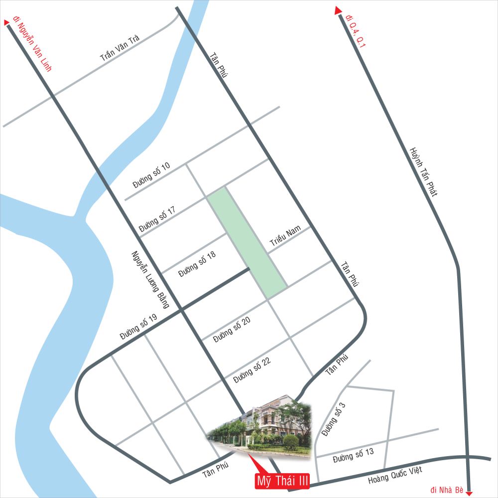 Đến Mỹ Thái 3 qua Đại lộ Nguyễn Lương Bằng rộng 48m, một trong những trục đường chính của đô thị Phú Mỹ Hưng với các dãy cao ốc văn phòng sử dụng hỗn hợp của khu T.T Hội nghị Triển lãm, T.T Thương mại Tài chính Quốc tế, giao dịch chứng khoán, nhà hàng, khách sạn, các dịch vụ… rất sầm uất.