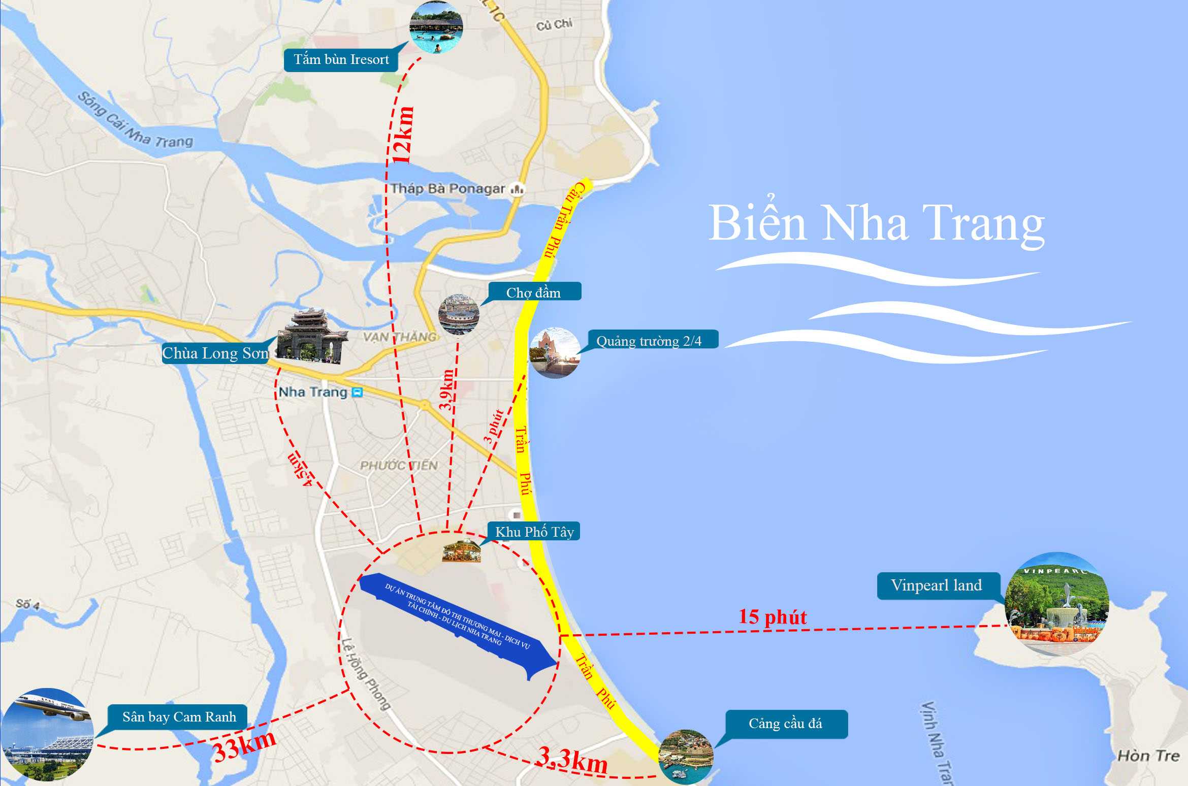 Đặc biệt, dự án thuộc khu phố tây, khu phố du lịch, tập trung nhiều khách sạn, nhà hàng. Sân bay Nha Trang gần chợ Bình Tân, cách cáp treo Vinpearl, An Viên, cảng du lịch 1,5km; cách Quảng trường 2/4 khoảng 1,7km; cách ga xe lửa khoảng 2,5km; cách chùa Long Sơn 3km; cách chợ Đầm 4km, cách Tháp Bà, Khu du lịch Hòn Chồng 8 phút đi xe máy.